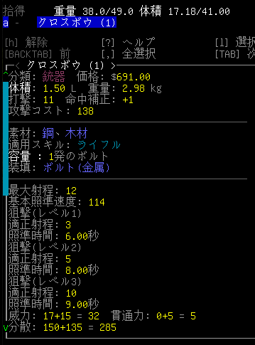 クロスボウの射程が9から12に伸びたぞ!そして威力は32、貫通力は5に上がった。これは強すぎるよなあ。下手な鉄砲よりも威力があるのだ。欠点があるとすれば装填時間の29秒だな。