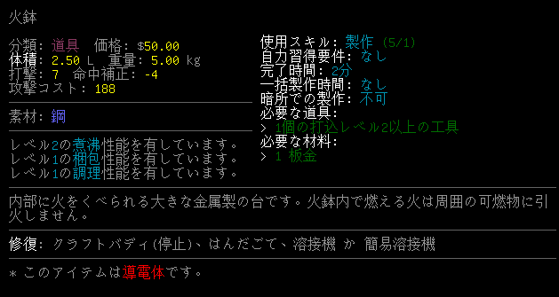 とある事情により火鉢を使いたくなりました。板金を材料にして火鉢のクラフトに取り掛かります。必要な道具は『打ち込みレベル2』の工具だ。『ハンマー(石)』があれば序盤でも火鉢を自作できますな。