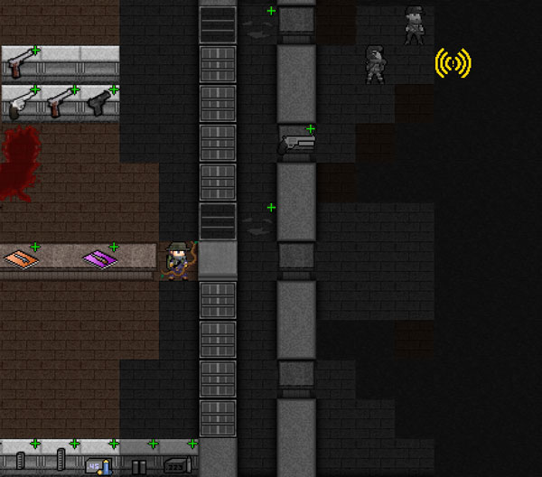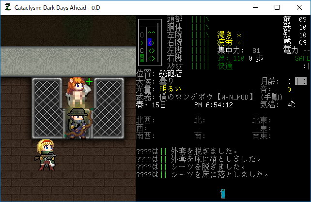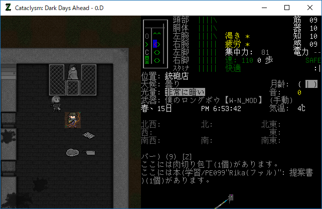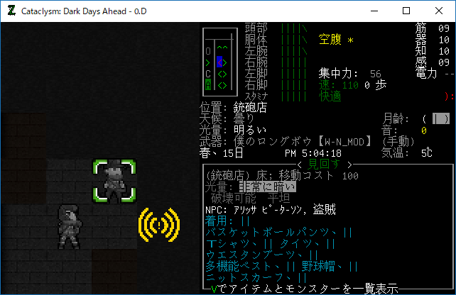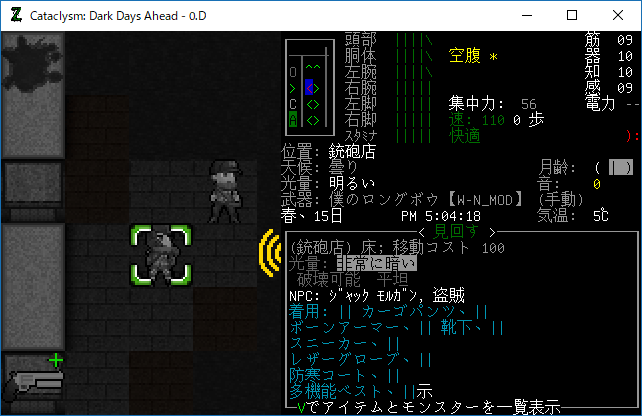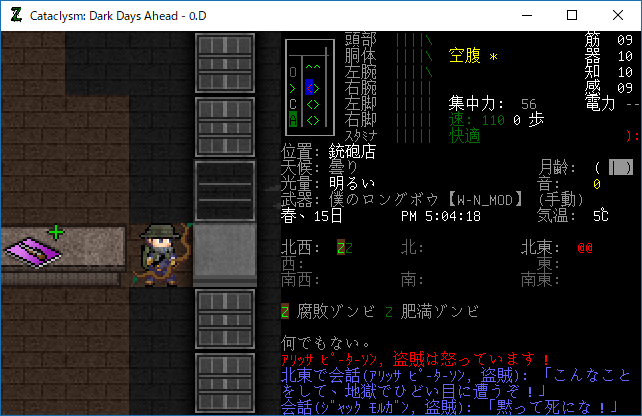 Cataclysmのプレイ日記を始めます。銃砲店に立て籠もる2人の盗賊を退治しました。運が良ければアジトを壊滅できそうだよね。外はゾンビの大群がいて危険だ。店内に突入してみましょう。