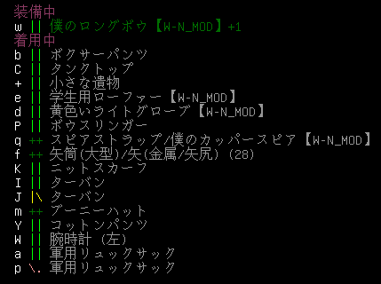 現在の装備品は上の画像です。ロングボウのおかげで衣類はほぼ無傷だ。次に町を探索する際は新しい弓を用意したいですな。次回はケモミミに可愛い服を着せて遊びます。