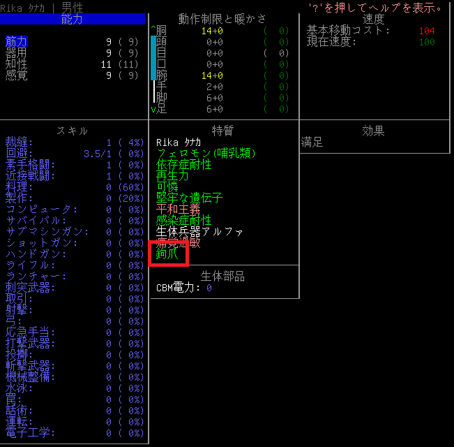 Rikaの能力は上の画像です。爪を消すには変異『鉤爪』を無くせばよろしい。爪が伸びているとせっかく絵師さんに描いてもらったドット絵が隠れてしまうからね。