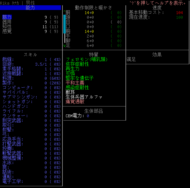Rikaの能力は上の画像になりました。強いのか弱いのか微妙な能力値ですね。『平和主義』のせいで戦闘スキルの成長が遅いのだ。