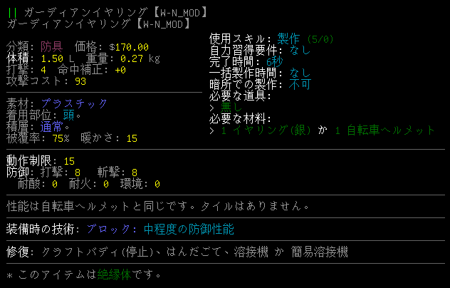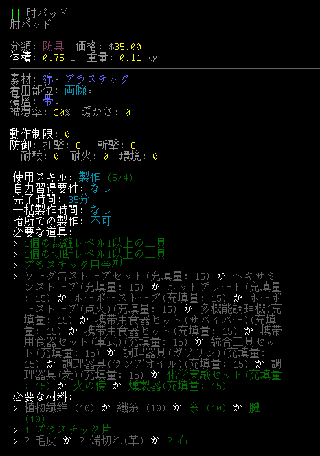 プラスチック金型により『肘パッド』のクラフトが可能になりました(膝パッドも)。防御性能が打撃8、斬撃8と高い。そのうえ動作制限は0という優遇っぷりだ。