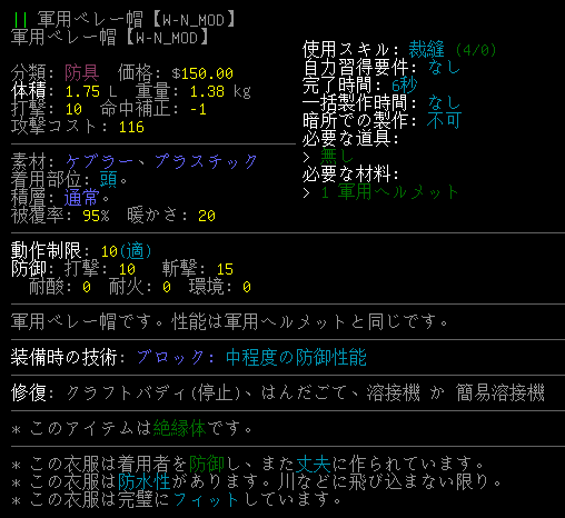 まずは頭部位の防具を作ろう。軍用ベレー帽という防具を用意しました。性能は軍用ヘルメットと同じです。防御性能は打撃10、斬撃15と突出している。