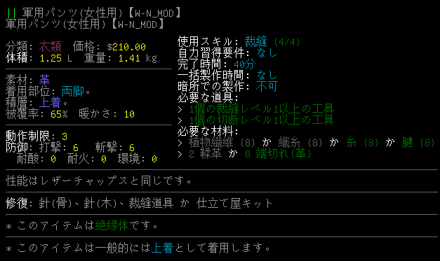 次はスカートを軍用パンツに取り替えます。性能とレシピはレザーチャップスと同じです。防御性能は打撃6、斬撃6となかなかのものだ。