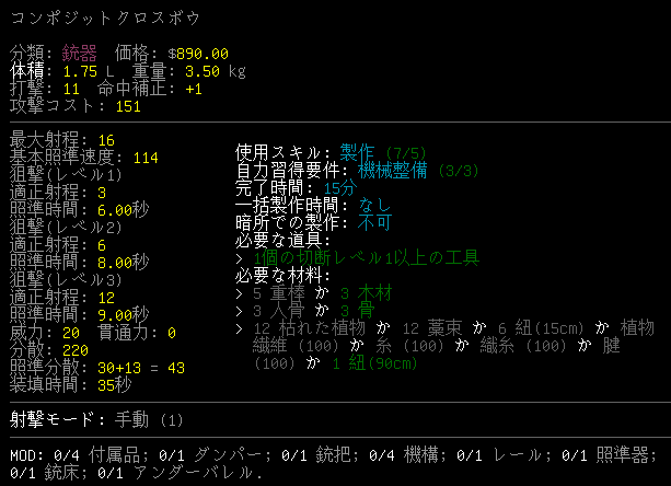 製作可能な弓で一番優秀な物はリカーブボウだと思われる。威力は『サバイバーファイティングボウ』の方が上です。しかし、射程は16とリカーブボウの方が優れております。
