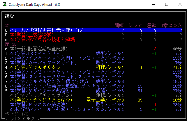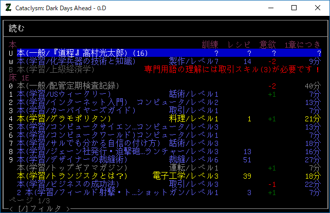 (書き殴りました。修正は後日になります)。Cataclysmのプレイ日記を始めます。今回は新しいクロスボウ等を作ろう。クラフトの前にスキル上げをしておこうかな。ちょっと手持ちの学習本を確認してみましょう。