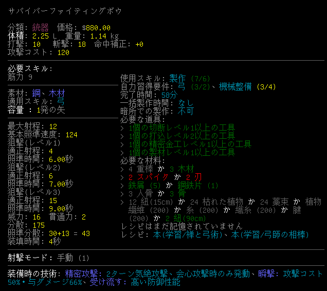 これまでの作業で『Rikaの防具』→『ナオミちゃんの防具』→『Rikaの武器』を作ったわけです。次はタロウ・タナカの新しい弓をクラフトします。上の『サバイバーファイティングボウ』は面白い弓ですね。打撃10、斬撃18の近接武器としても使用できるみたい。