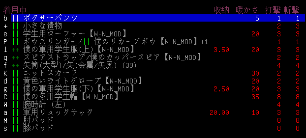 タロウ・タナカの防具は上の画像です。布製の防具ばかりでさすがに可哀想だな。こんなんでも胴体部分の動作制限は48だからね。現在よりも強い装備を身に付けてしまうと戦闘時に支障が出てしまう。
