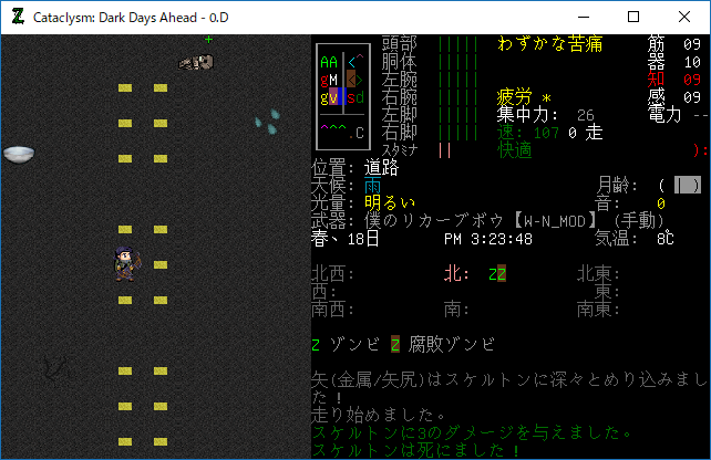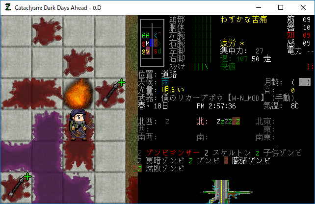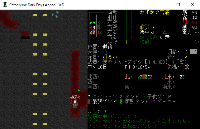 (書き殴りました。修正は後日になります)。Cataclysmのプレイ日記を始めます。中央区でゾンビの大群と交戦しています。ゾンビマンサーのせいで生きた心地がしないよ。よく見たらスケルトンまでいやがるのか。