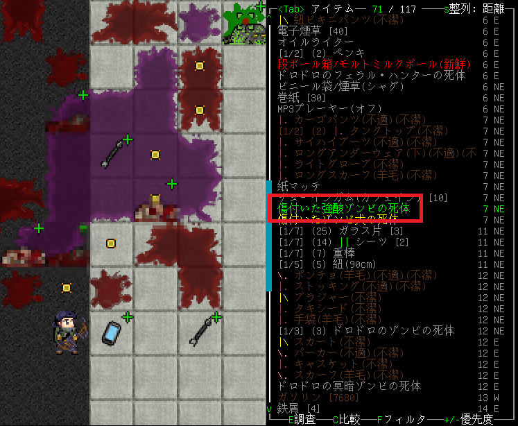 強酸ゾンビは酸だまりの中にいるから上に乗ることも出来ない。アイテム整理コマンド『/』で亡骸だけを動かします。さて動かした亡骸をどう処理したものか。