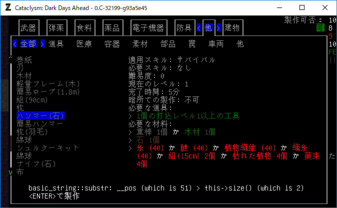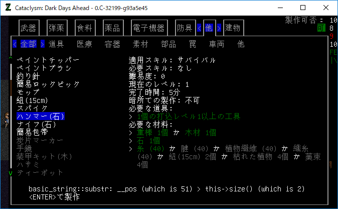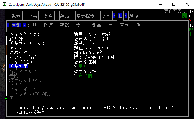 この投稿は「Cataclysm Dark Days Ahead」のプレイ日記です。毎日更新をします。目次はこちら。