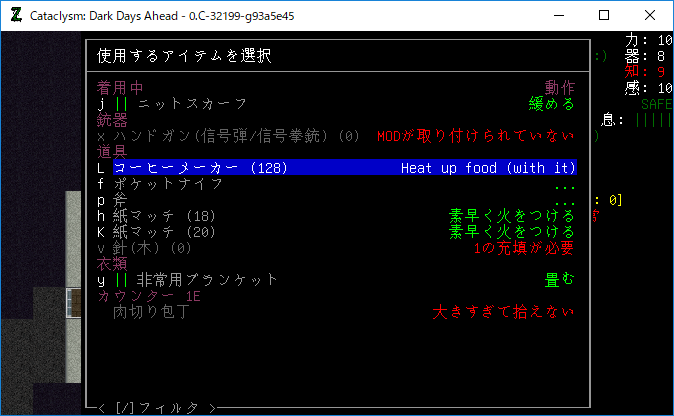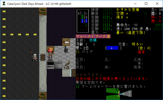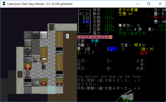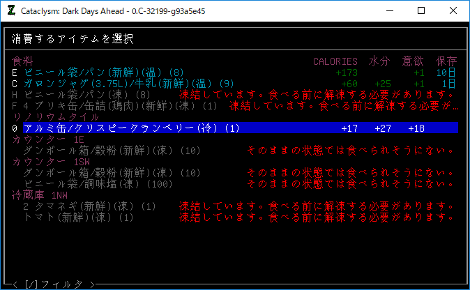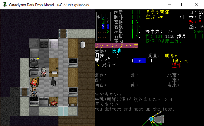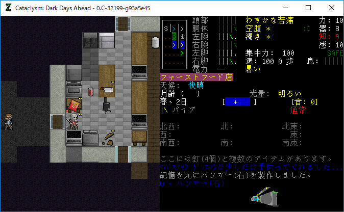 Cataclysmのプレイ日記を始めます。食料の解凍に成功しました。そろそろ日が暮れるかもしれません。安眠できるよう窓に板を打ち付ける方法を覚えたい。