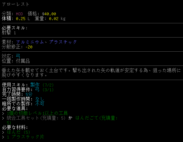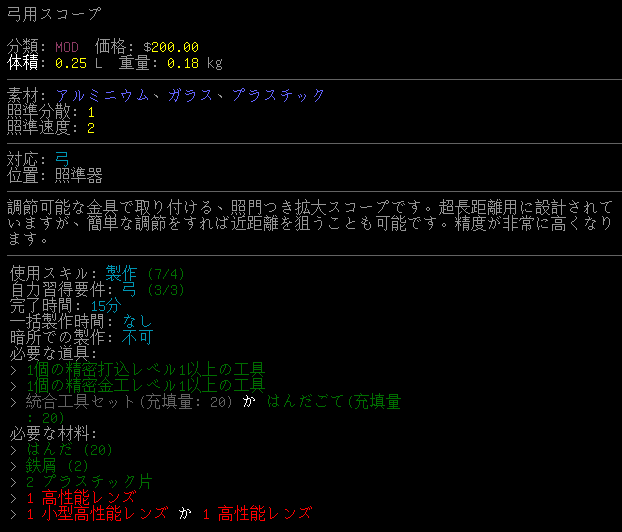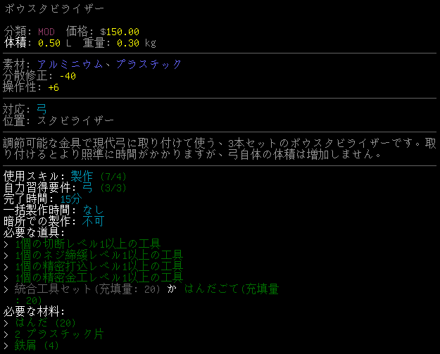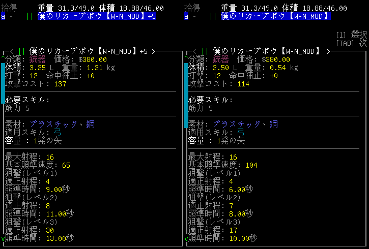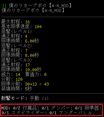 アローレストの製作が完了しました。『a』コマンドで使用すると作成したMODを取り付けられます。MODの取り付けは後でまとめてやりますね。性能の変化を調べたいのです。