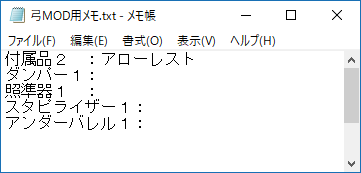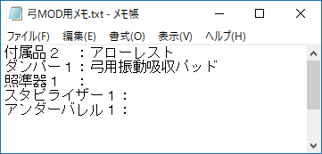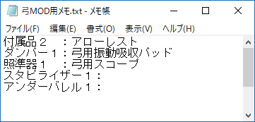 それでは今回の本題である弓のMOD作成に取り掛かろうか。リカーブボウに取り付けられるMODは上の画像です。ちなみにロングボウはダンパー1つだけしか取り付けられなかった。