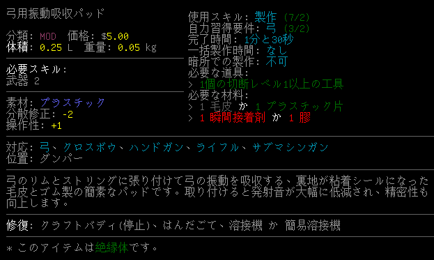 作成可能なダンパーは『弓用吸収パッド』のみだった。こいつはロングボウに取り付けていたMODです。ゆえに作るまでもなく持っている。