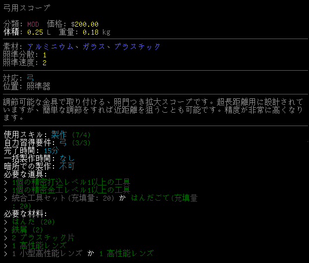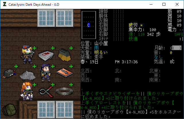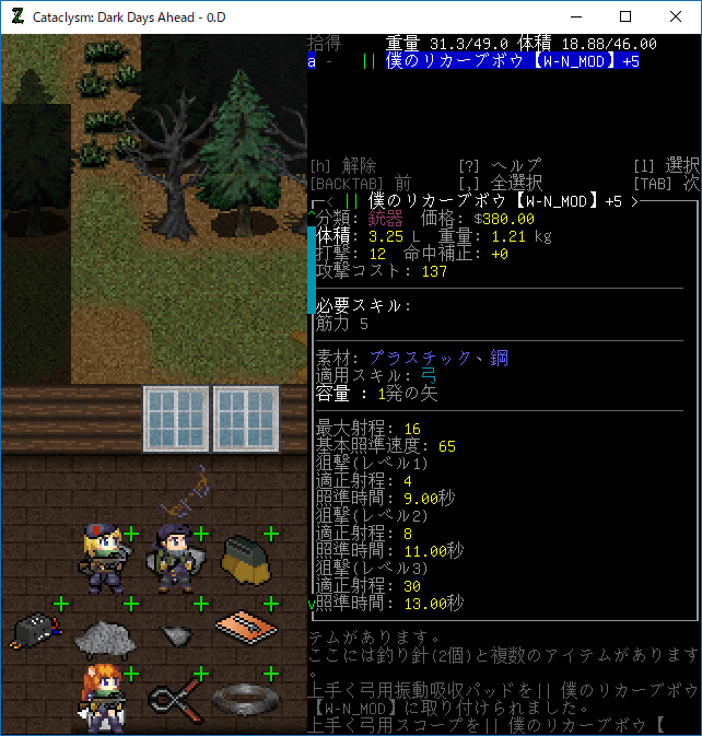 (書き殴りました。修正は後日になります)。Cataclysmのプレイ日記を始めます。中世武器を製作する設備が整った。今すぐにでもレスターに攻め入りたいところだが踏みとどまります。今回はリカーブボウにMODを取り付けて強化したい。
