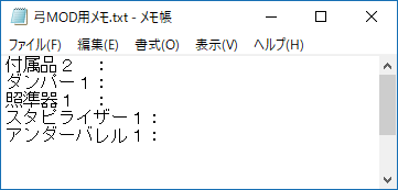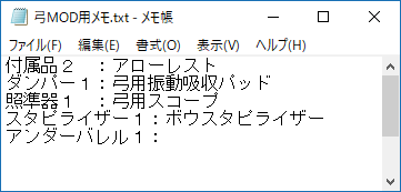 未製作のMODは『スタピライザー』と『アンダーバレル』だけだ。俺は弓に詳しくないから名前を見てもピンとこないな。照準器くらいしかイメージできません。