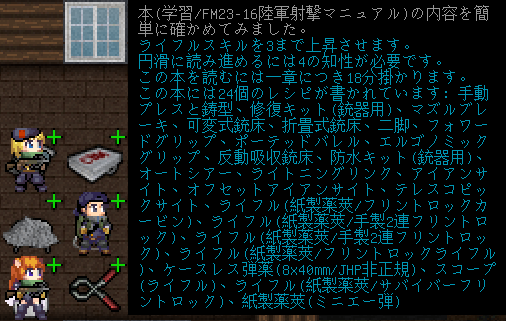 『FM23-16陸軍射撃マニュアル』はライフルスキルの本です。ライフルスキルはクロスボウに影響するからNPCと一緒に読むのも悪くはない。記載されているレシピは紙薬莢やMODだ。