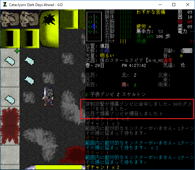(書き殴りました。修正は後日になります)。Cataclysmのプレイ日記を始めます。洗剤が欲しくてレスター南地区にやってきました。苦戦の末、ゾンビマスターの撃破に成功する。奴をサクッと倒せたのは幸運だった。