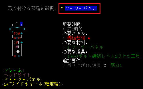 ソーラーパネルの取り付けは機械整備スキル4が条件になります。スキルレベル3では自宅に太陽光発電機の設置すら無理なのか。車の整備を行うのは時期尚早だった。
