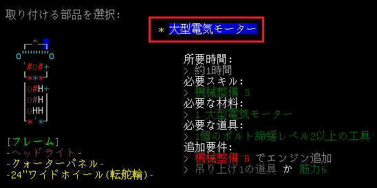 ハイブリッドカーに改造するには機械整備が8にならないと無理だった。Cataclysm:DDAは車に複数のエンジンを取り付けられます。ただし高度な技術を有していないとできません。
