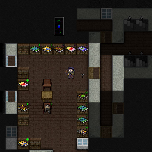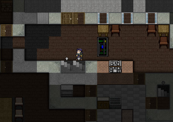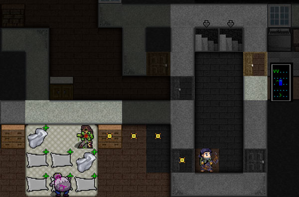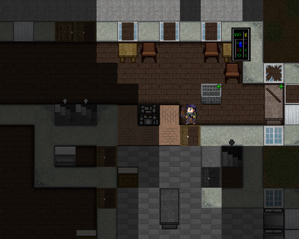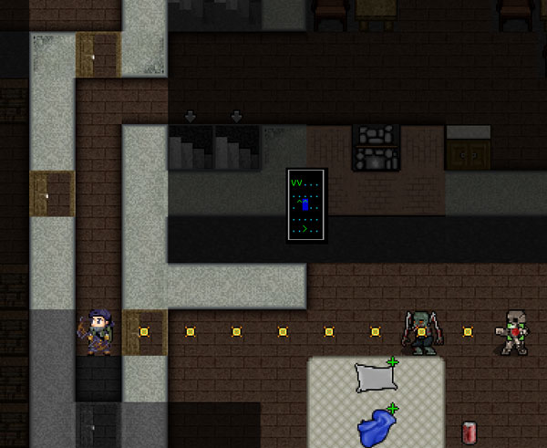 階段の上で『X』コマンドを押した後に階下を指定する『>』を押します。すると地下室を覗き見れるのですな(上の図)。地下の先は弱いゾンビしかいません。安心して突っ込みましょう。