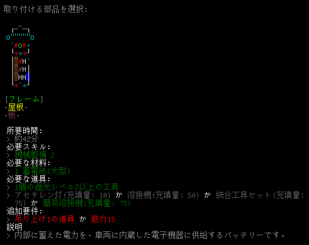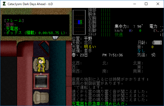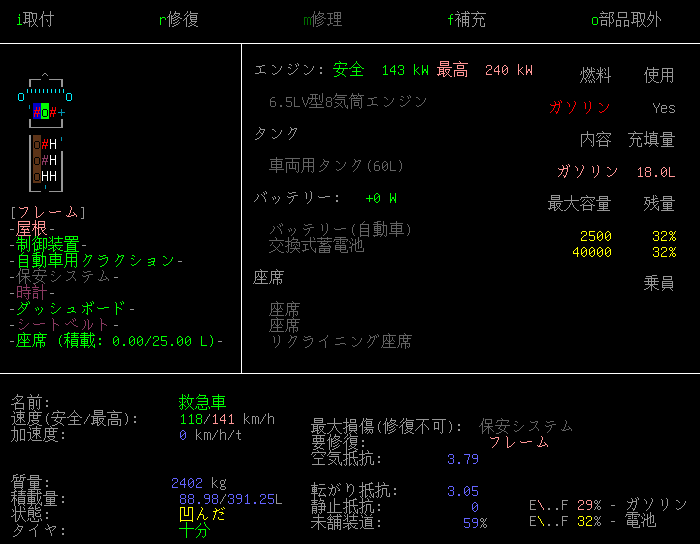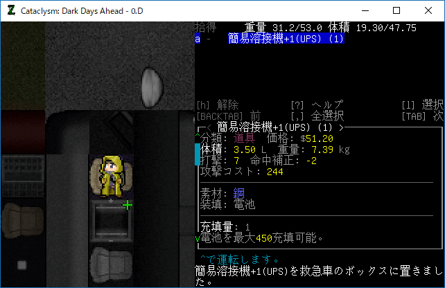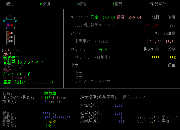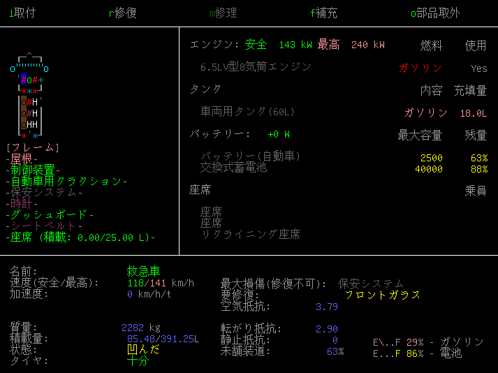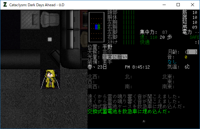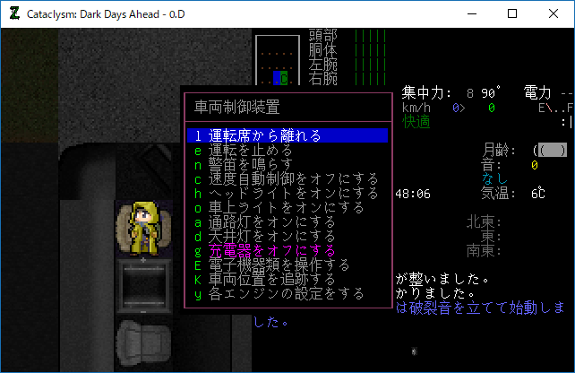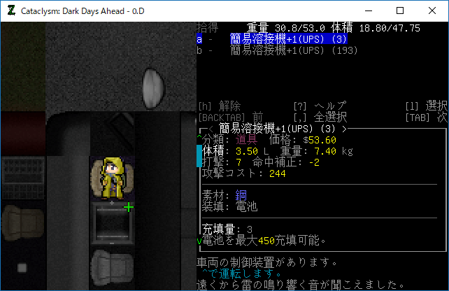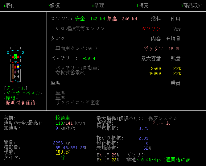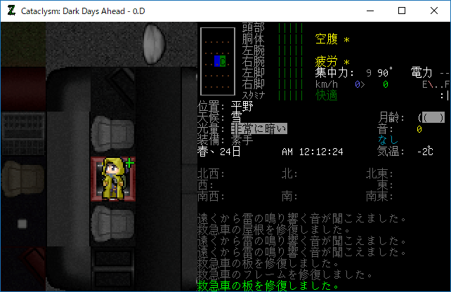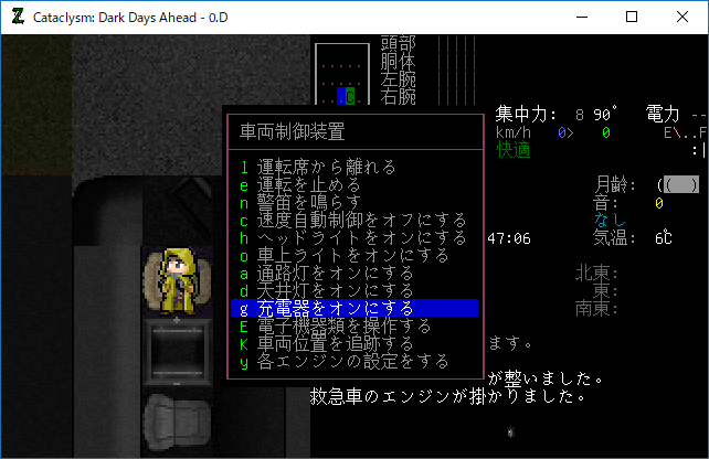 (書き殴りました。修正は後日になります)。Cataclysmのプレイ日記を始めます。救急車の主要部品を修理しました。これからは車に乗って町を探索しようぜ!今回は充電器を利用してバッテリーの電力を取り出します。