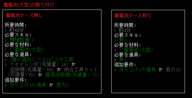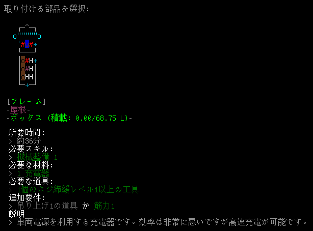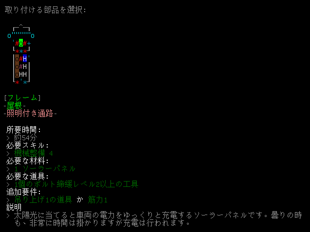 充電器を設置する条件は簡単みたいですね(上の図)。機械整備スキルは1あれば足りるし工具もレンチだけで充分なのだ。