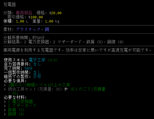充電器の難易度は電子工学スキル3と低い。材料はコンソールを分解すれば簡単に集められる。めちゃくちゃ高性能な部品なのに簡単に作れるから嬉しいっすねえ!