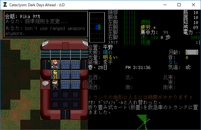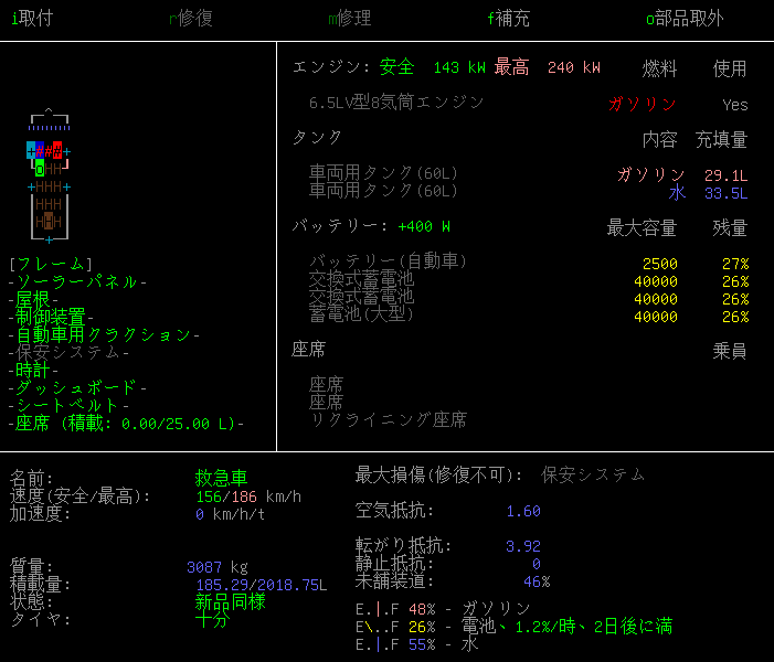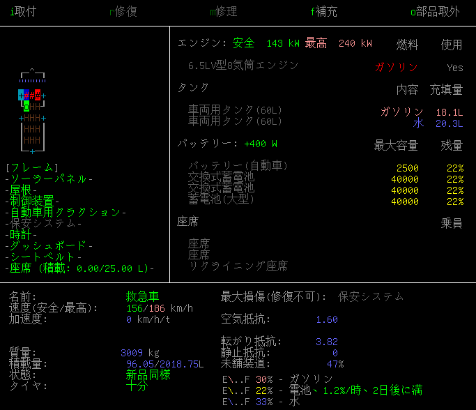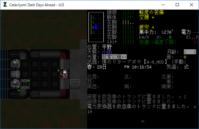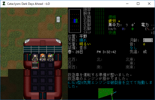 (書き殴りました。修正は後日になります)。Cataclysmのプレイ日記を始めます。救急車の修理が一段落しました。今回はこの車に乗って町へ繰り出そうかな。救急車の華々しい実戦デビューとなります。