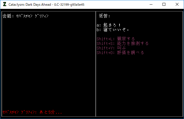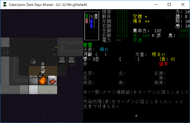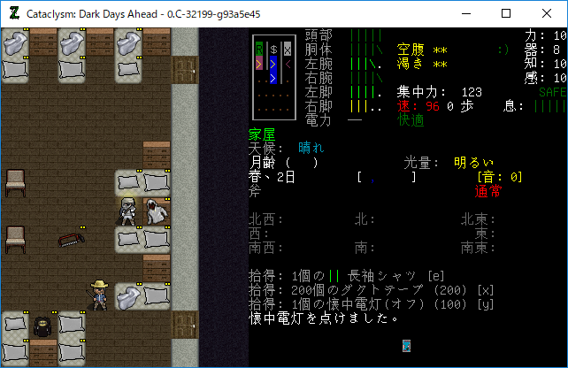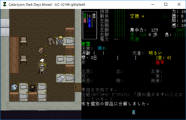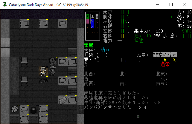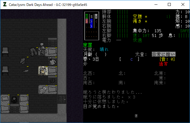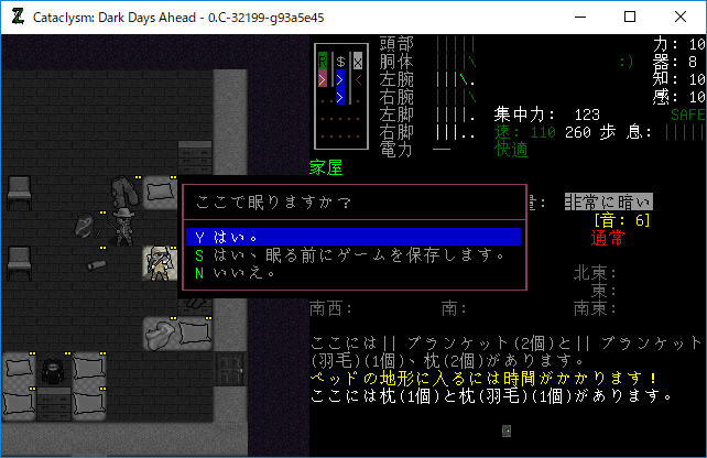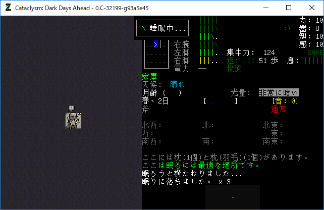 Cataclysmのプレイ日記を始めます。2日目は街を駆けずり回って大変だったよ。日が暮れて暗くなりました。睡眠をとって夜間探索をしようかな。