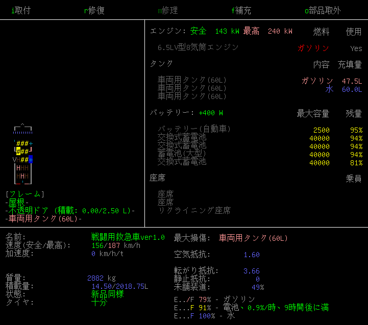 救急車の性能は上の画像になりました。ガソリンとバッテリーが貯まってきましたね。もう電気自動車に改造しても大丈夫だと思われる。バッテリーが減ってきたらガソリン車に切り替えれば良いし。