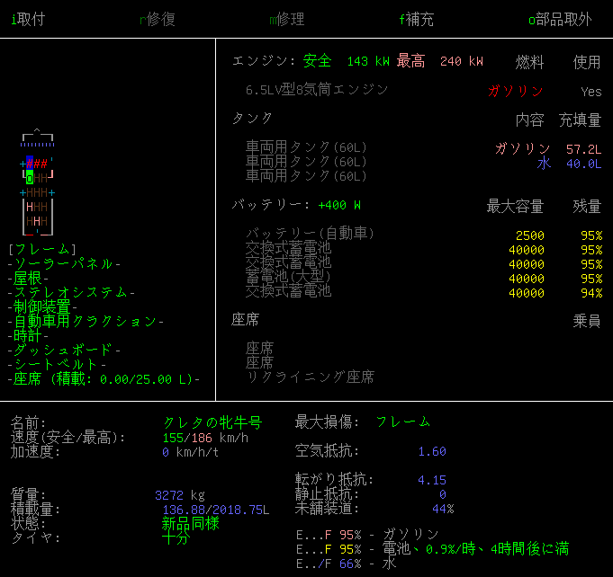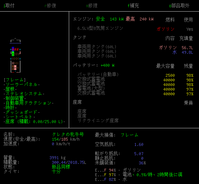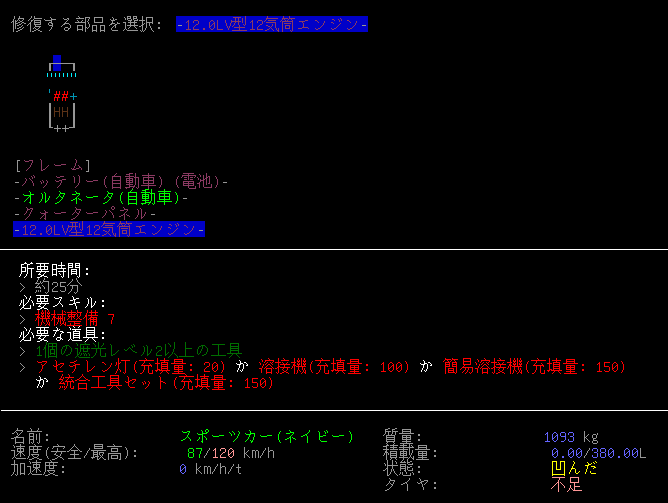 12.0LV型12気筒エンジンは小さなスポーツカーに搭載されていました。修理をするのに機械整備スキルが7も必要なのかよ!この初心者サバイバーお断り感に誘惑されてしまうなあ。破損しているせいで安全速度が87km/hと低い。