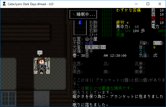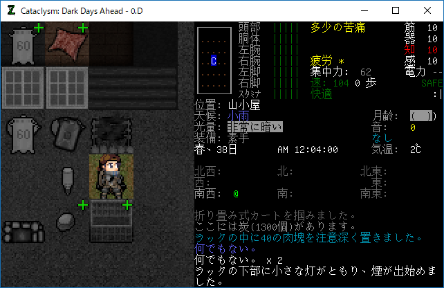 Cataclysmのプレイ日記を始めます。山小屋での作業が一段落しました。今回は町に行って物資を略奪しようかな。もう夕方だから遠くには行けないけどね。