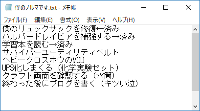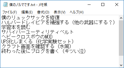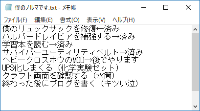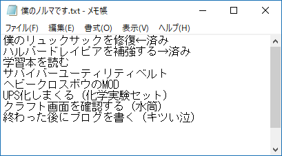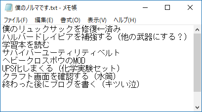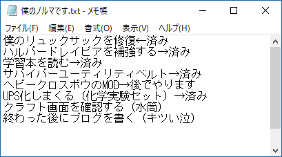 今日中に実行したい作業をメモに書きました(上の図)。複合施設でサバイバーベルトの材料をゲットしたんだよな。はんだも回収したのでUPS変換キットを量産できます。