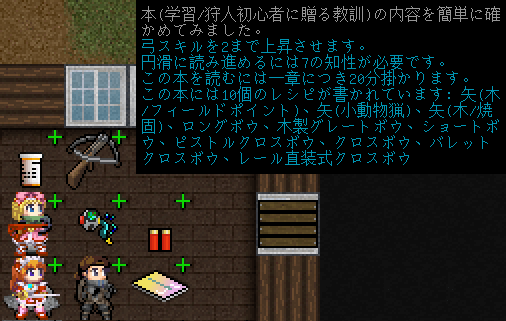 『狩人初心者に贈る教訓』は弓スキルを2に鍛える学習本でした。ロングボウのレシピを知ることができるし序盤に入手できたら役に立ちます。矢のレシピも書かれているけど木製の矢ばかりだから苦労しそう。