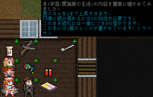 『罠猟師の生活』は罠スキルを1にする初心者本だよ。トラバサミのレシピが書かれているけど作ることはないだろう。トラバサミなんて非人道的な兵器は使いません。