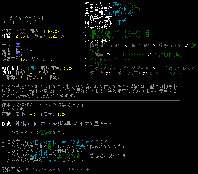 まずは複合施設でゲットした『鞘(小型)』を材料にしてサバイバーベルトを作ります。サバイバーベルトは収納3.00に容積1.00と優秀な装備だ。