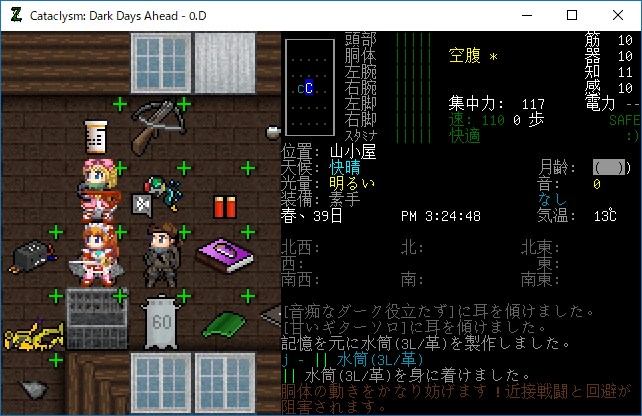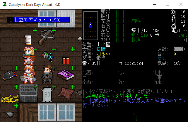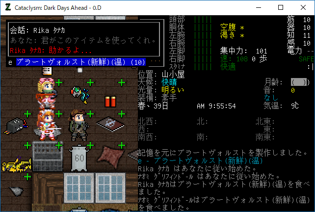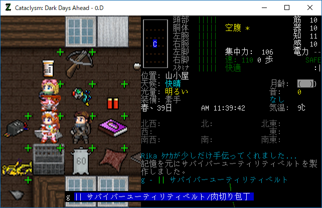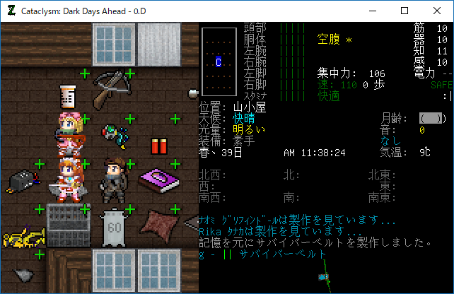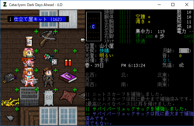 Cataclysmのプレイ日記を始めます。昨日は丸一日レスターの町を駆け巡って疲れたあ。多くの有用な物資を補充することができました。今回はクラフトを楽しみたいと思います。