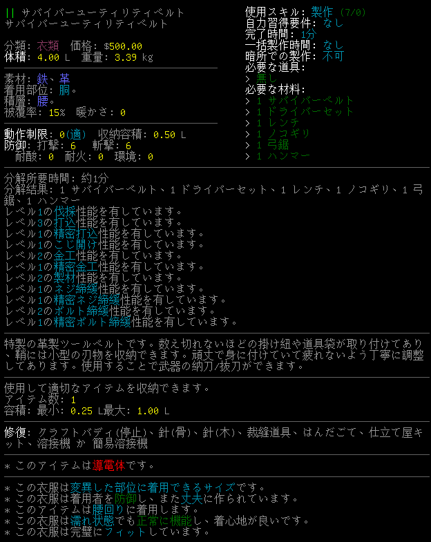ようやくサバイバーユーティリティベルトをクラフトできるぞ。胴体部位に身に付ける動作制限0の装備であり工具箱と同じ性能があります(たぶん)。こじ開け性能レベル1だから簡易バール(こじ開け性能レベル2)の代用にはならない。