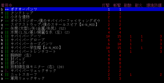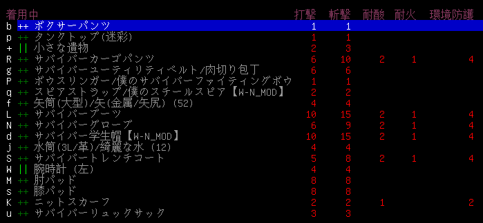 タロウ・タナカの防具を全て補強しました。各防具の性能は上の画像です。サバイバー装備の耐酸と環境防御がプラス1されている。防具の補強『++』をすると性能が上がるのだ(ぶっちゃけ忘れていたあ)。