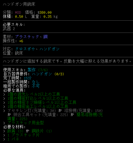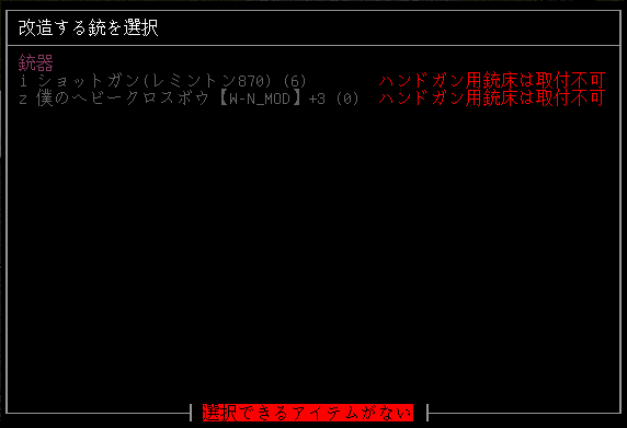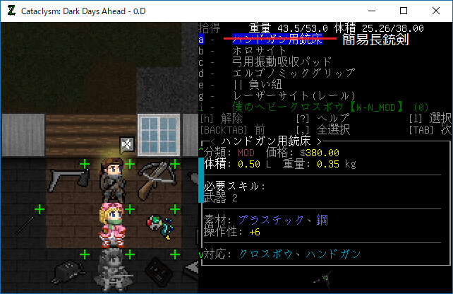 せっかく作ったはいいがハンドガン銃床をクロスボウに取り付けられなかった(上の図)。クラフト画面には『対応:クロスボウ、ハンドガン』と書いてあったのにな。まあいいや、銃床は無しでいきます。