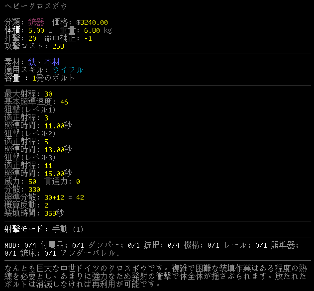 ヘビークロスボウ単体(ボルト無し)の性能は上の画像になる。ボルトの装填時間に6分も掛かるってのは厳しすぎる。何のMODをいくつ取り付けられるのかメモしておこうか。
