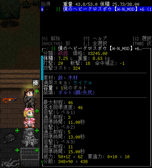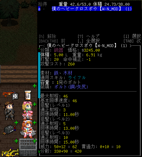 ボルトを装填したクロスボウの性能は上の画像です。適正射程が10なのは短すぎる。最大射程が46もあるのにアンバランスだな。まあこれがヘビークロスボウの特徴なんでしょう。