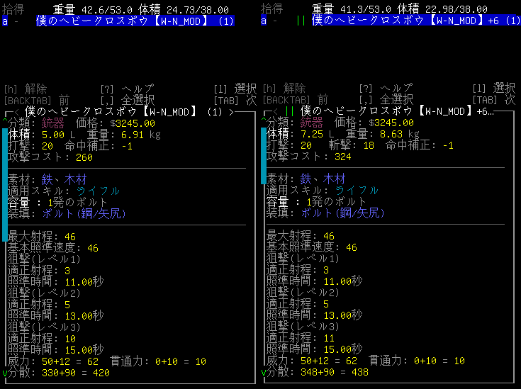 ヘビークロスボウにMODを取り付けました。性能は上の画像になった。うーむ、何か変わったのか分からないぞ(笑)。MODを付ける以前と比べてみましょう。