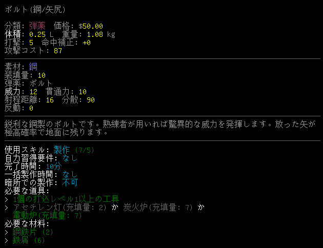 クロスボウの性能はボルトを装填した後に決まる。装填するボルトによって威力や射程距離が変わります。今回は上の『ボルト(鋼/矢尻)』をヘビークロスボウに込めることにした。