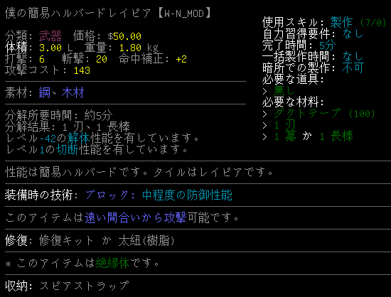 簡易ハルバードレイピアは頼りになるけど壊れやすいのが欠点だ。2本目を作って予備にしましょう。町を探索している最中にボロボロになったら新品に取り替えればよろしい。