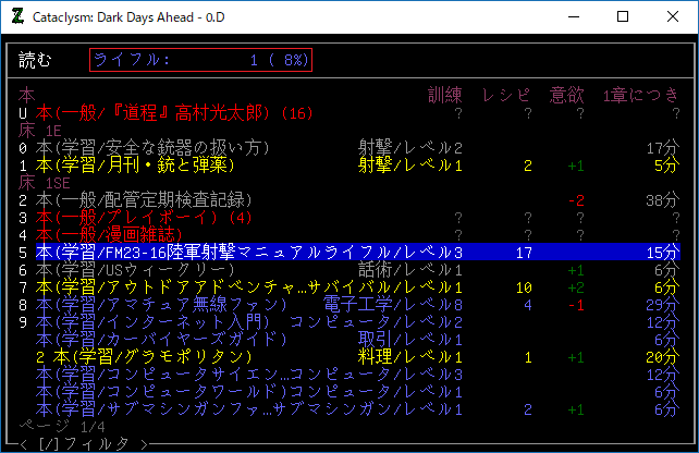 6時間ほど読書をしてライフルスキルが2になりました。スキル上げだけで日付が変わってしまったよ(笑)。眠いけど我慢して作業を続けます。