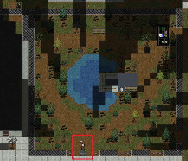 遊歩道に到着しました。ここは公園ですな。木々を切り倒せば多くの木材が手に入ります。鉄柵からは鉄線をゲットできる。おまけに水源まであるのか。アイテムは落ちていないけど特定の物資が大量に手に入る素敵な公園です。